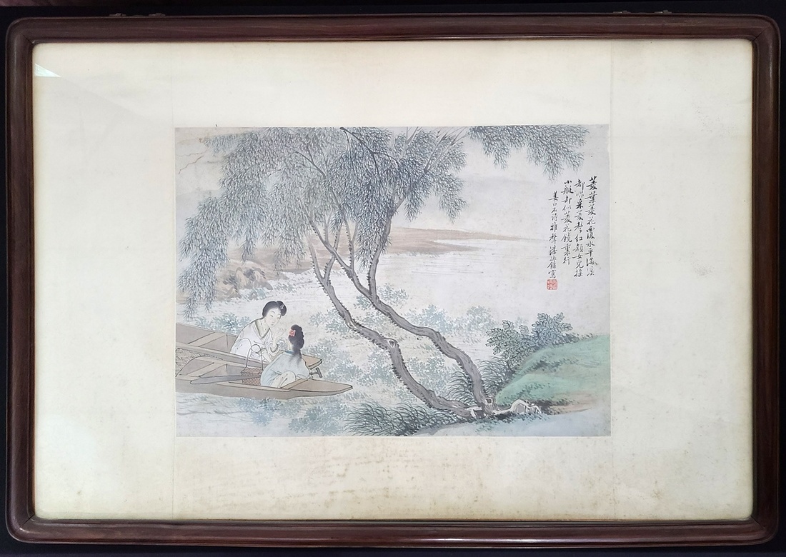 1852-1921 Pan Zhenyong "Double Beauty Picking water chestnut". colour and ink on paper, there is a poem on the painting. with his sign and seal. Size: with mahogany frame 55x80.2cm