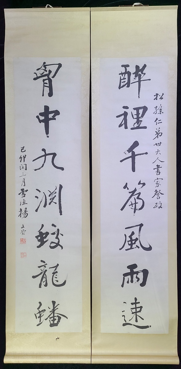 1879年楊文瑩(1838-1908) 行書對聯掛軸一對; 釋文: 醉裡千篇風雨速 胸中九淵蛟龍蟠; 款識: 松孫仁弟世大人書家詧政 已卯閏三月雪漁楊文瑩; 鈐印: 楊文瑩印 (白文) 丁丑翰林 (朱文). 尺寸: 41x171cm (x2)