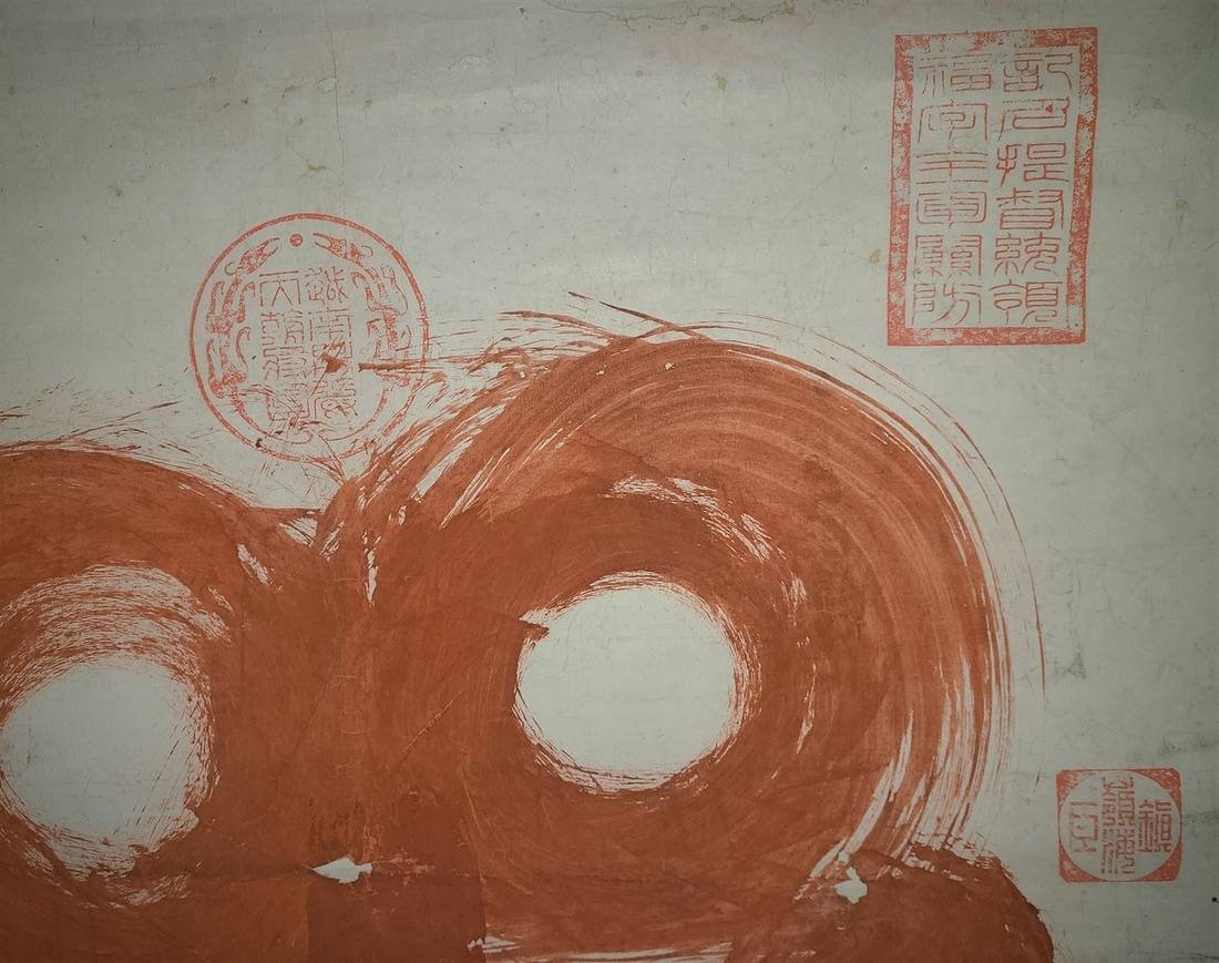 黑旗將軍劉永福罕見硃砂"虎" 字巨幅中堂, 年代約為中法戰爭時期 (1883年12月至1884年4月), 此虎字做型奇特, 筆走龍飛, 氣勢超凡. 抽象之中突顯了虎之威嚴肅殺之氣, 正值中法之戰, 實足以大振軍威. 上蓋有"越南男爵天朝將軍" 圓型篆書朱文印, 右上蓋 "記名提統領福字全軍關防" 長方形篆書朱文印. 篆書"嶺海鎮臣" 朱文印, 左下鈐"淵亭" 朱文印及"臣劉永福" 白文印. 國內僅見廣西壯族自洽區博物館有藏劉永福墨繪虎字中堂, 但以硃砂書虎字, 目前則僅見此幅. 䆬為中國清末中外戰史之重要文物. 因年代久遠, 略有破損. 尺寸: 81x265cm (書法尺寸66.5x137cm),