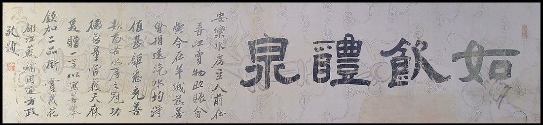 1900年代方政題贈香港安樂水房主人書法 "如飲醴泉" , 鏡心, 紙本. 並撰文以贊許安樂水房公司在香港及廣州的慈善活動, 並將活動所得款項悉數捐出. 此實為早年香港安樂汽水廠的難得文史資料. 鏡心, 紙本, 有修補. 尺寸: 49x177.5cm.