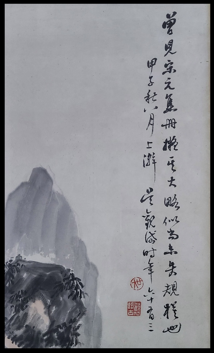 1924年吳觀岱(1862-1929) 山水畫作 "松蔭觀峰" , 鏡心, 紙本設色; 題識: 曾見宋元集册擬其大略似尚未失規模也; 款識: 甲子秋八月上澣吳䩤岱時年六十有三; 鈐章: 吳 (朱文) 觀岱臨古(白文); 尺寸: 連紅木鏡框 81.5x158cm