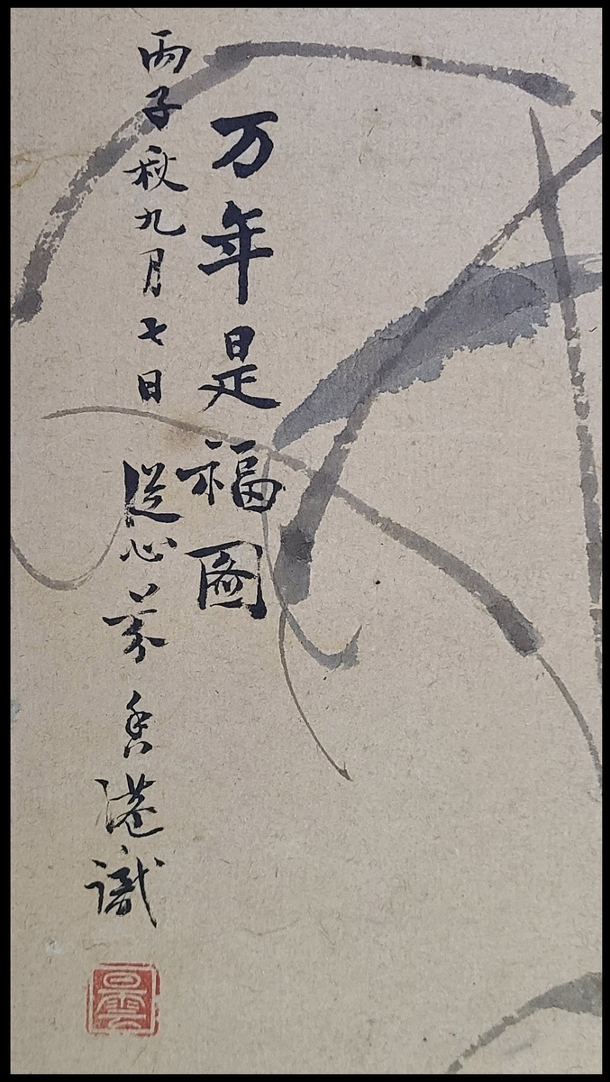 1936年鄧芬"萬年是福圖" , 鏡心, 紙本設色, 款識: 丙子秋九月十日從心芬香港識; 鈐印两枚: 曇(白文), 我乃酒狂 (白文), 尺寸: 連紅木鏡框47x124.5cm