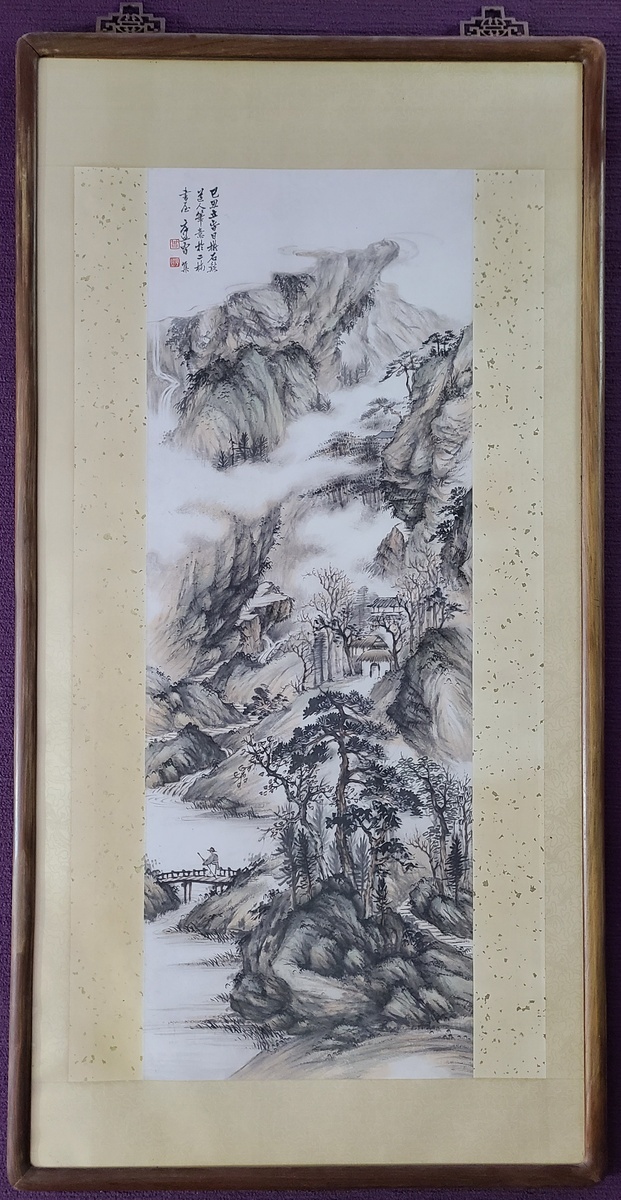 1949年曾厚熙山水畫作 "秋谷閒步", 鏡心, 紙本設色; 款識: 已丑立春日擬石谿道人筆意於二楠書屋厚熙曾集; 鈐印: 曾 (朱文) 厚熙 (白文); 尺寸: 連紅木鏡框 81.5x158cm