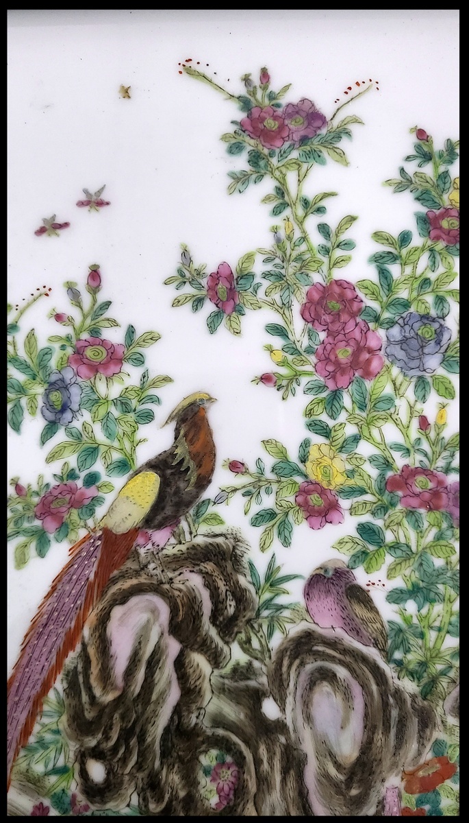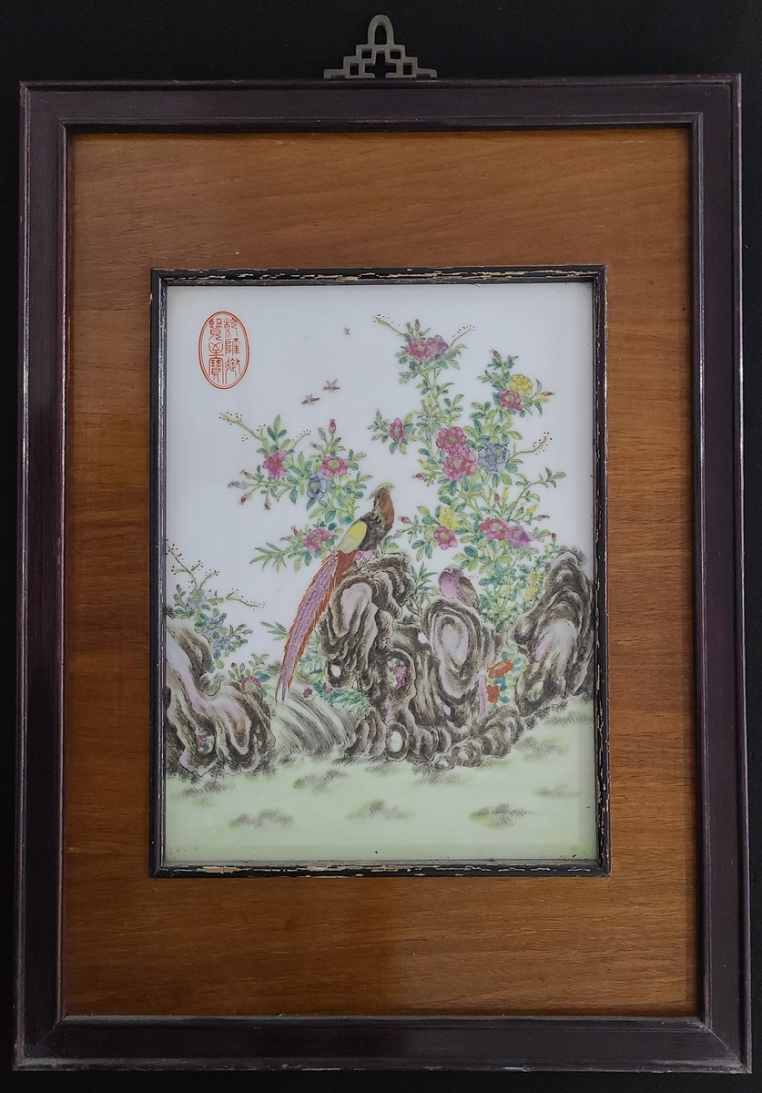 1950-1960年代中國磁面畫"花卉雙鳥", 磁面尺寸: 22x29.5cm, 連木框尺寸: 36.5x39.5cm