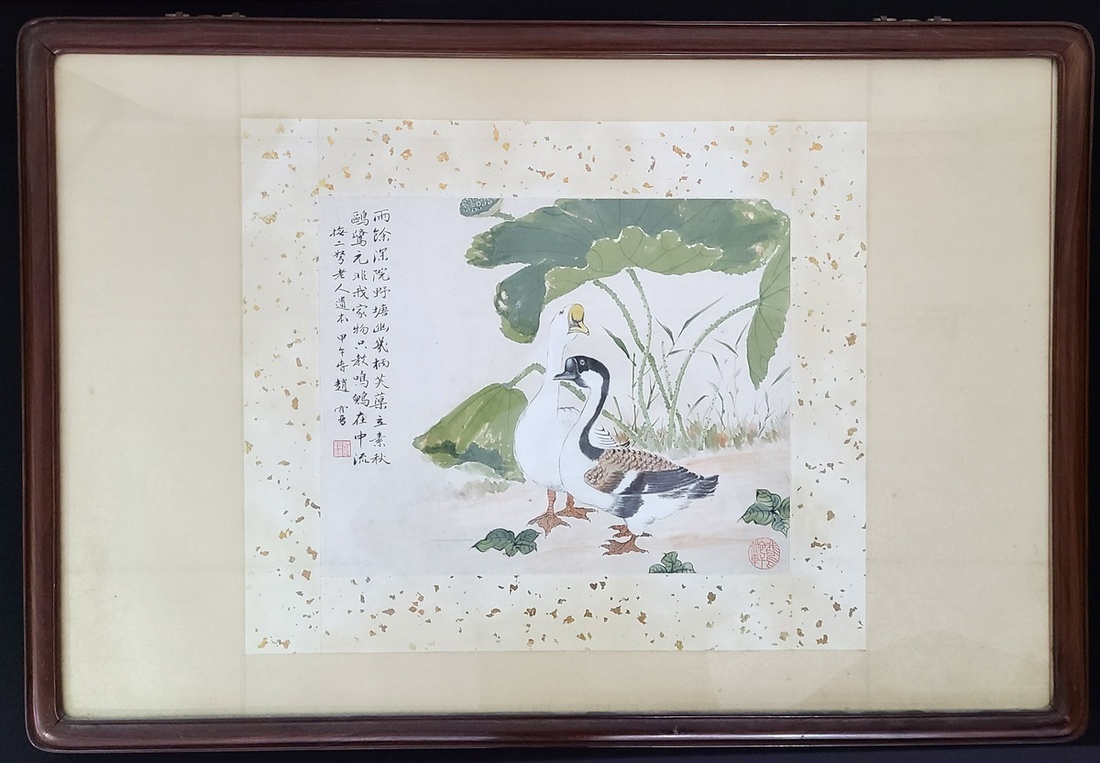 1954年趙鶴琴(1894-1971) "荷䈎雙鵝" 圖, 鏡心, 紙本設色; 題識: 雨餘深院野塘幽, 幾柄芙蕖立素秋, 鷗鷺元非我家物, 只教鳴鶂在中流; 款識: 撫二弩老人遺本 甲午旾(春) 趙鶴琴; 鈐印: 趙鶴琴 (白文); 尺寸: 連紅木鏡框55x80.2cm