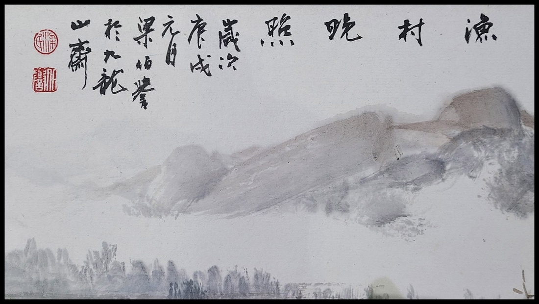 1970年梁伯譽(1903-1978) "漁村晚照圖" 紙本設色, 鏡心; 題識: 歲次庚戍元月梁伯譽於九龍山齋; 鈐印: 梁氏 (朱文) 伯譽 (白文). 尺寸: 50.5x136.5cm