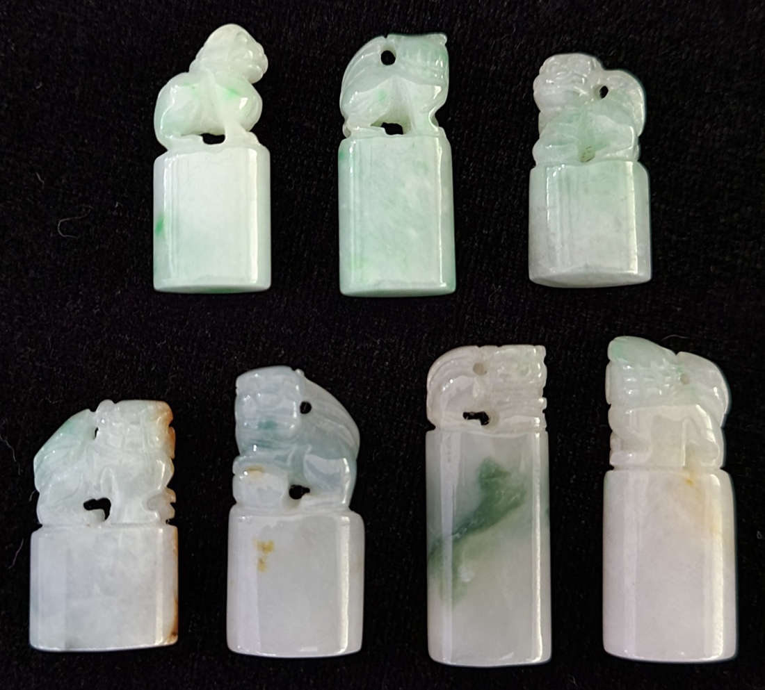 1970-1980年代綠玉小印章七枚, 均彫有獅子, 大小不一. 尺寸平均約1.2x2.8cm