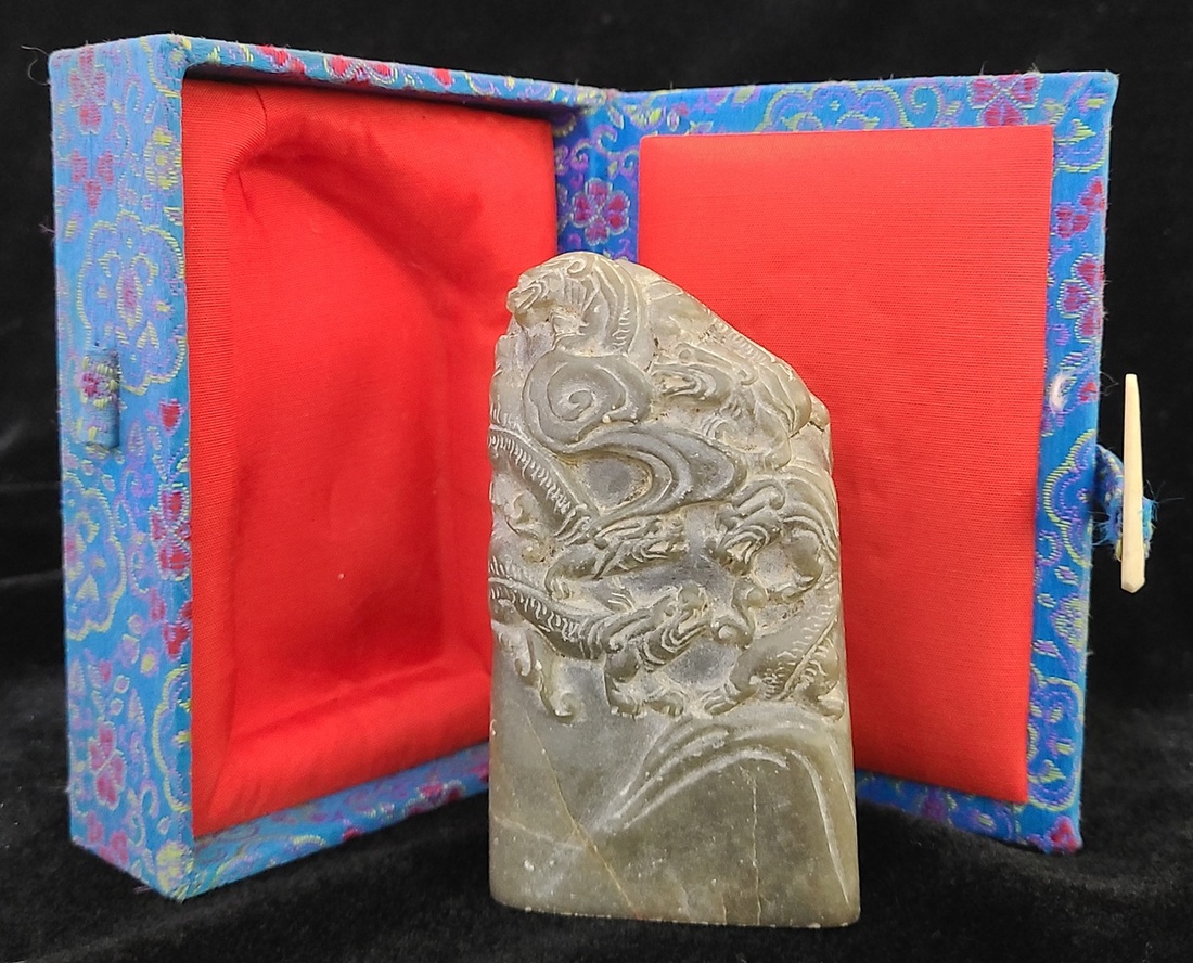 1970-1980年代壽山石印章, 正面刻雲紋靈獸, 石質暗綠半透明. 尺寸:5x9x1.8cm