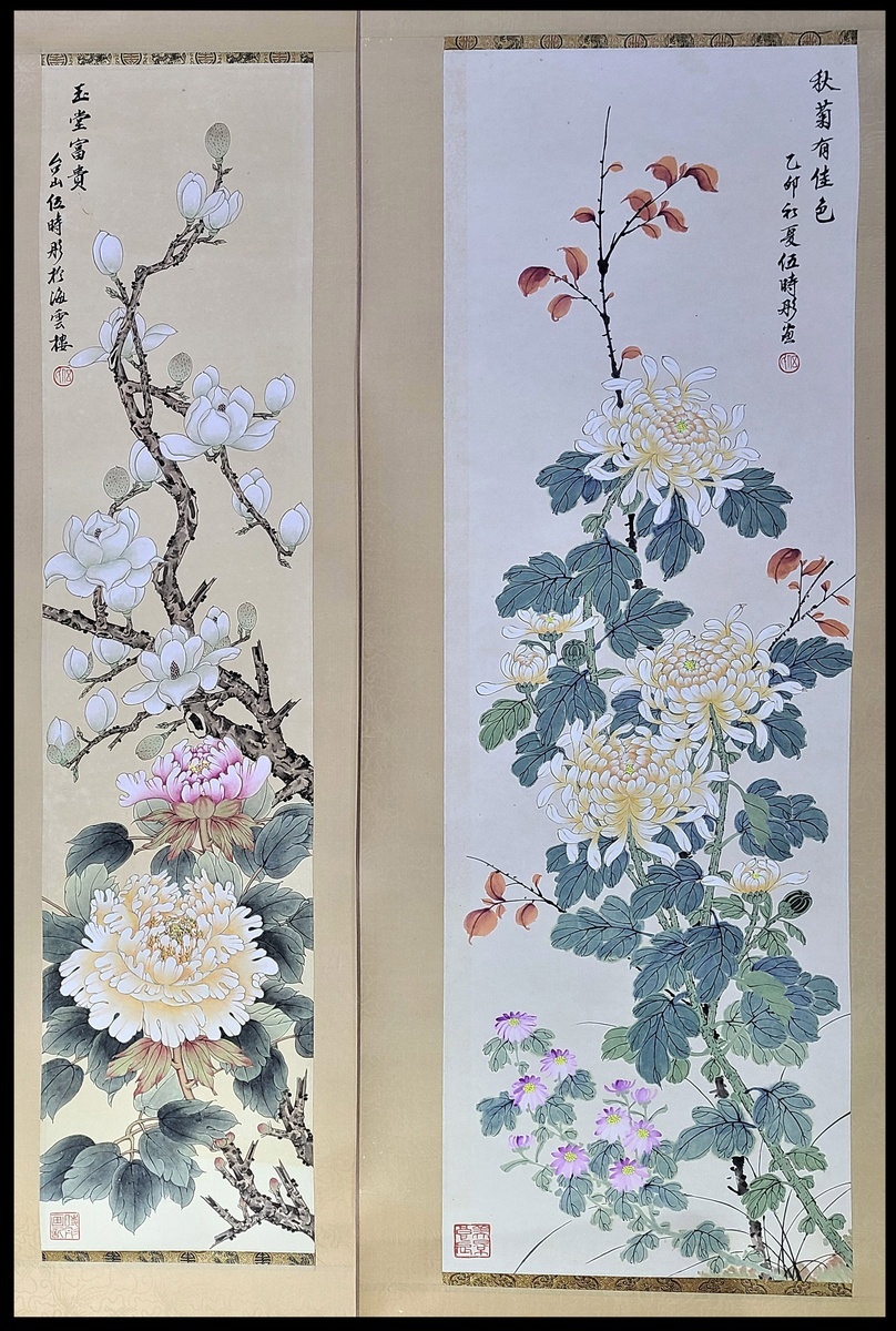 1975年伍時彤 "秋菊有佳色" 及"玉堂富貴" 花卉鏡心两幅, 紙本設色. 鈐印: 伍氏 (朱文) 及閒章; 尺寸: 35.5x143.5cm, 48x144cm.
