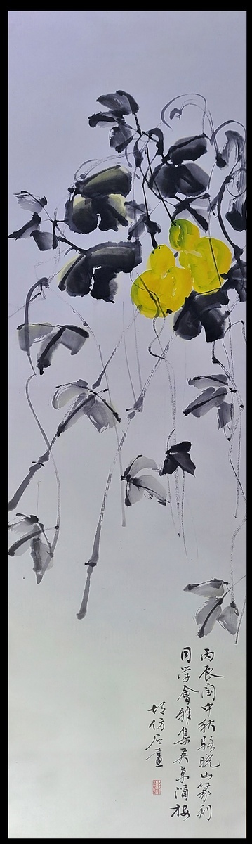 1976年胡仿石 "葫蘆圖", 立軸, 紙本設色; 款識: 丙辰閏中秋駱曉山篆刻同學會雅集英京酒樓 胡仿石畫; 鈐印: 胡仿石 (白文). 尺寸: 51x226cm