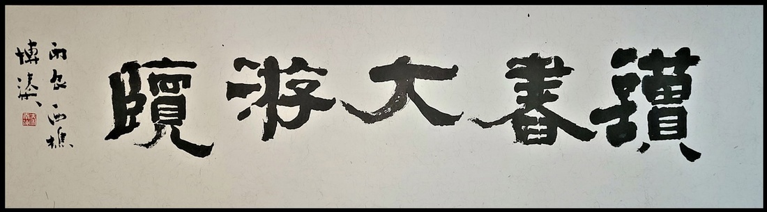 1976年羅博溱隸書橫披 "讀書大游覧", 鏡心, 紙本; 款識: 丙辰西樵博溱; 鈐印: 溱南海 (白文); 尺寸: 51x149cm 註: 羅博溱, 廣東南海人, 擅書法, 乃香港著名金石家羅叔重 (1898-1968) 之子.