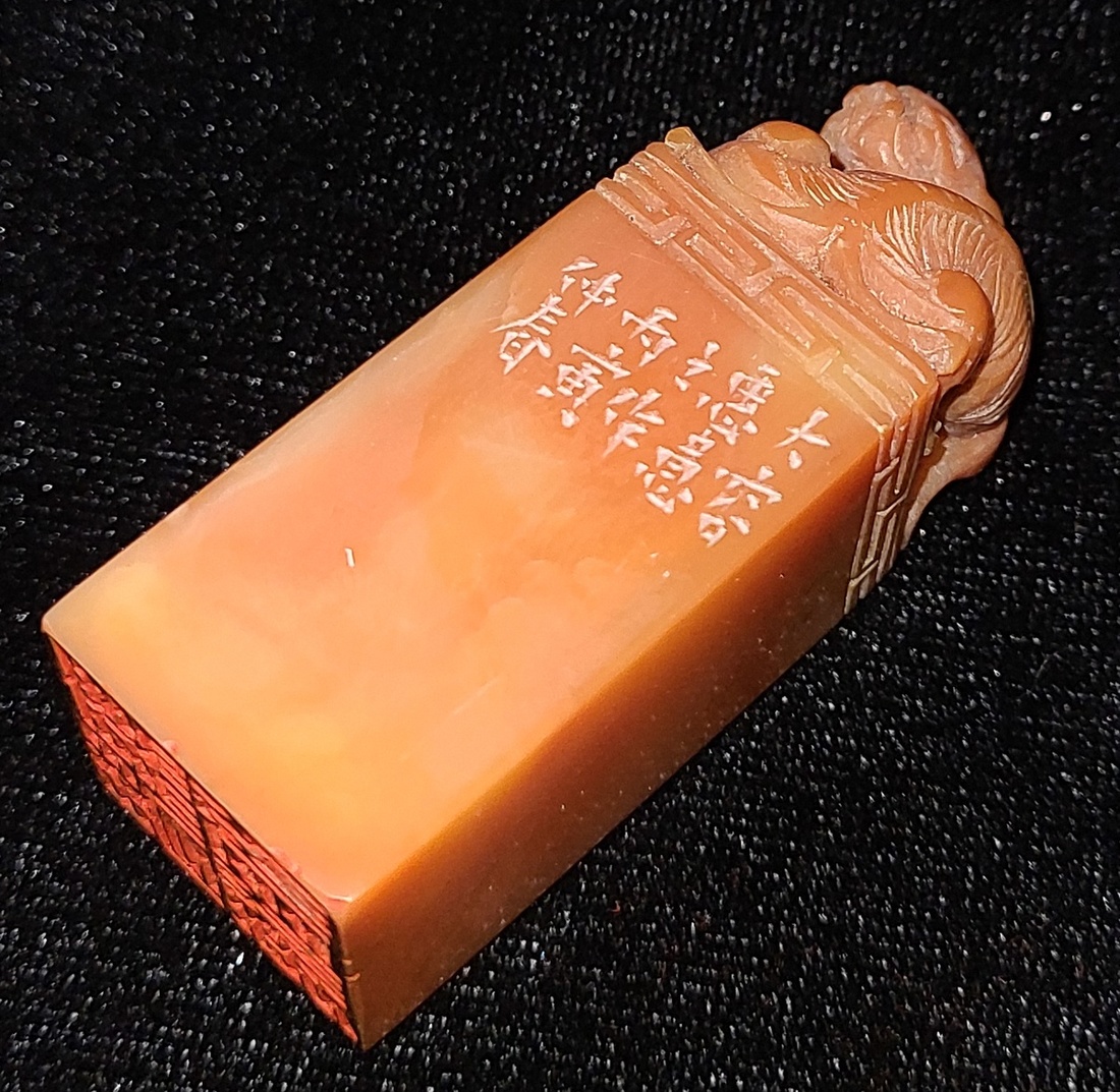1986年帶丙寅茅大容款 (淅江人) 圖章, 白文 "學海無涯". 印章石材為坐獅"高山紅凍". 高6cm 寬2cm