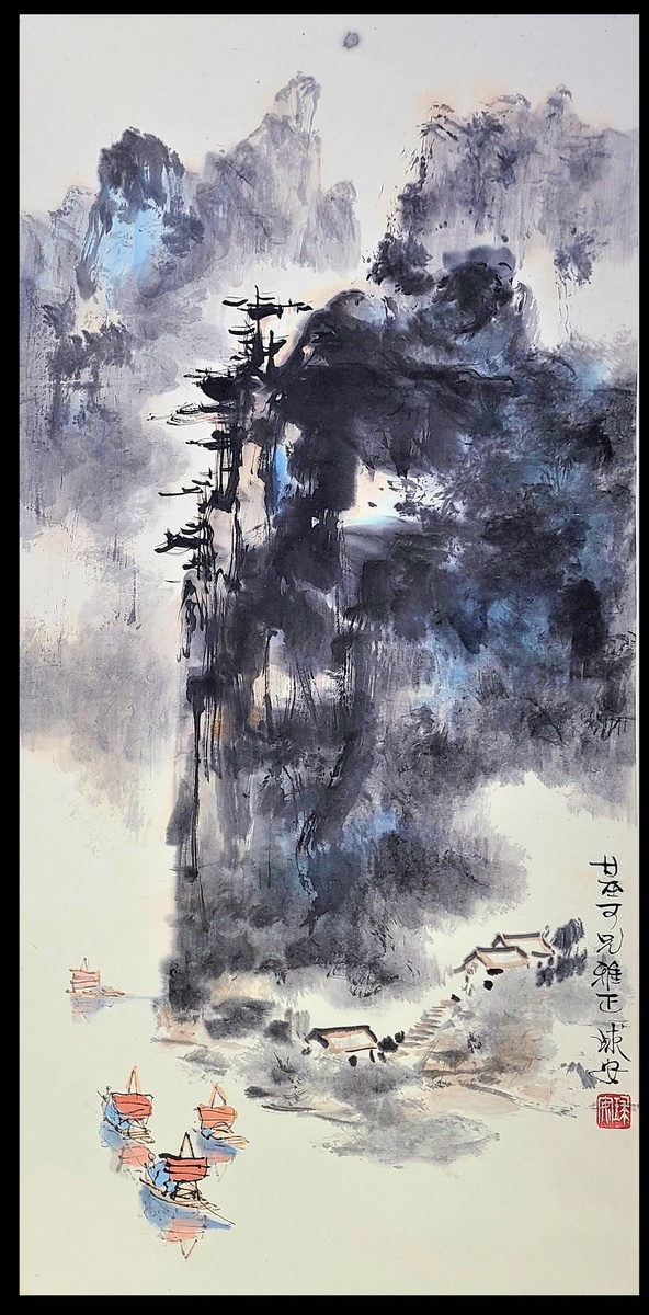 Chen Qiu'an (1946-) presented a landscape painting to Dr. Wai Kee Haw; Hanging scroll, ink and color on paper; With painter's seal. Size: 48.5x178cm