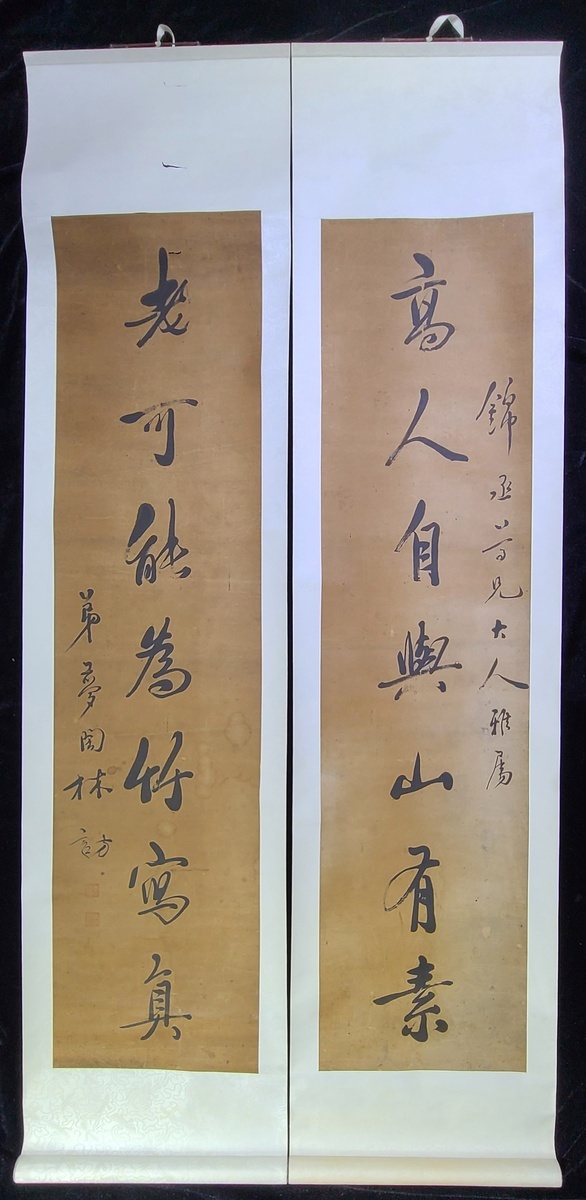 林訪(夢陶) 行書對聯掛軸一對; 釋文: 高人自與山有素 老可能為竹寫真; 款識: 錦丞兄大人雅屬 弟夢陶林訪; 鈐印: 夢陶 (白文) 林訪(白文); 尺寸: 40x169cm (x2)