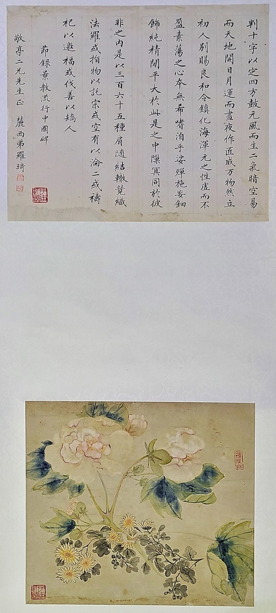 羅?書法及花卉立軸, 紙本設色, 年代不詳, 上有羅?印章及"宇宙軒藏" (朱文). 尺寸: 37.5x164cm