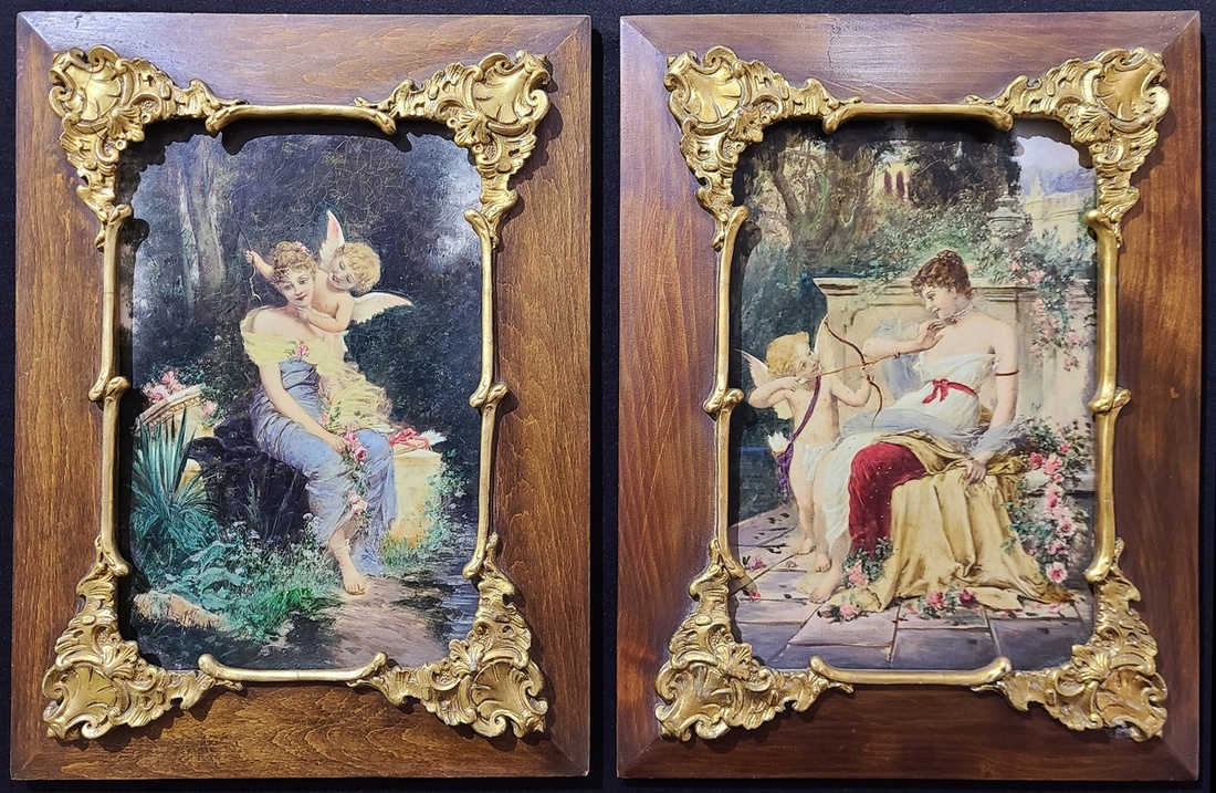 20世紀早期歐洲裝飾油畫两幅, 均配漆金刻花木畫框. 每幅尺寸: 30x38.5cm (連畫框)