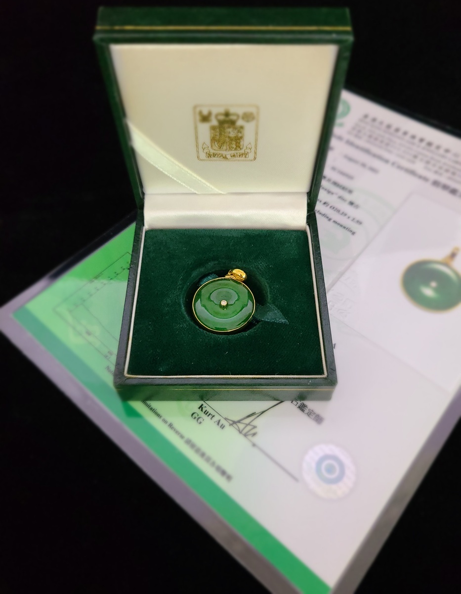 翡翠圓形吊飾, 鑲金邊及中央嵌入鑽石. 附鑑定証書一份直徑: 約2cm
