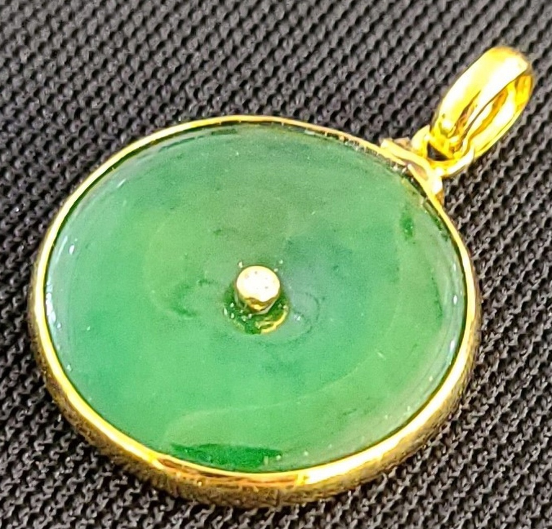 Jadeite round pendant with gold rim and diamond in the center. Comes with an appraisal certificate. Diameter: Approx. 2cm