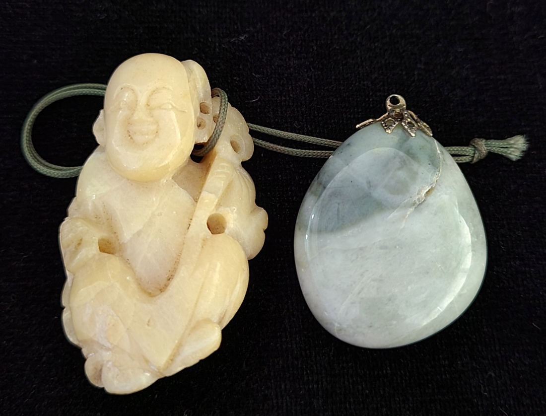 玉石刻佛吊件及雲紋石吊件各一. 尺寸: 4.5cm長, 另一3cm長