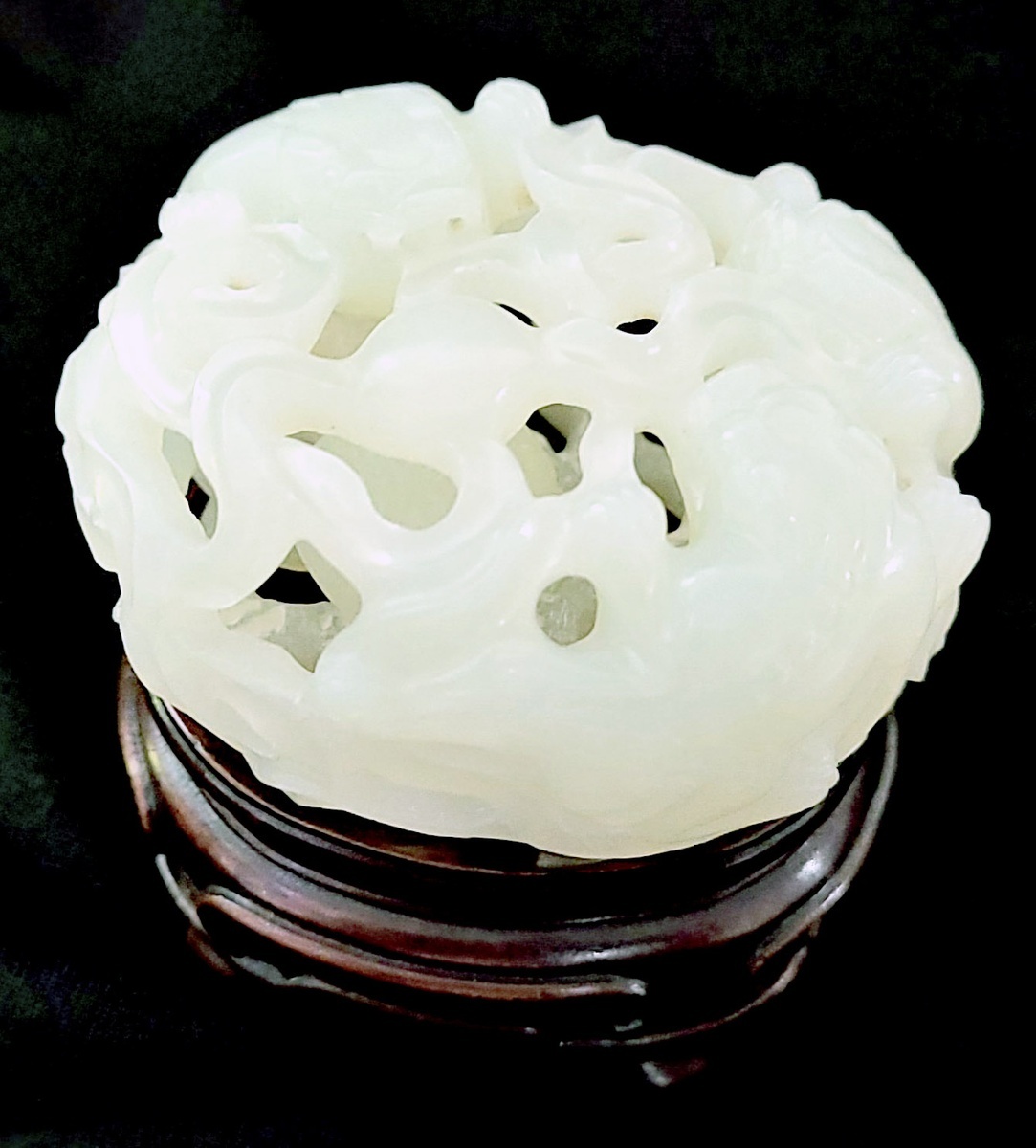 三獅戲珠鏤空白玉彫飾件, 內裏彫流動玉珠一顆, 帶紅木底座. 此件彫工精緻, 玉色温潤. 有微裂, 敬請預覧. 玉件尺寸: 4.7cm寬x5.2cm長x2.5cm高