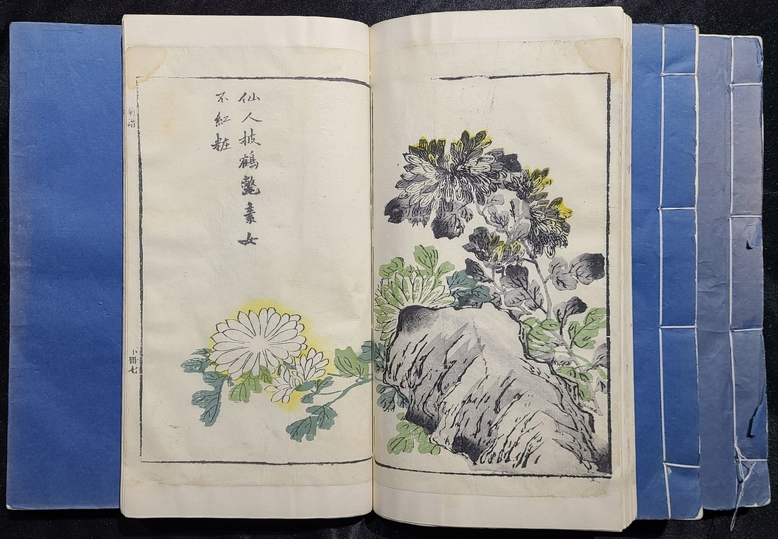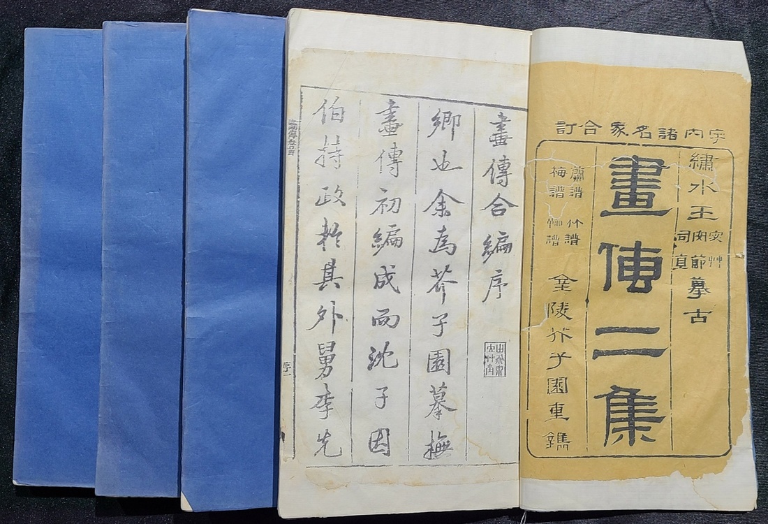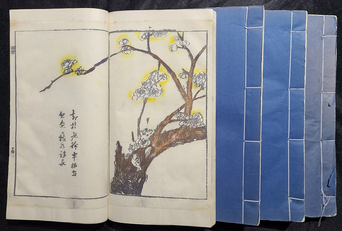 嘉慶庚申 (1800年) 芥子園重刊畫傳二集 "梅, 籣, 竹,菊" 四譜, 全書木刻彩色套印, 金鑲玉共線裝四厚册八卷全. 每册尺寸28.7x17cm