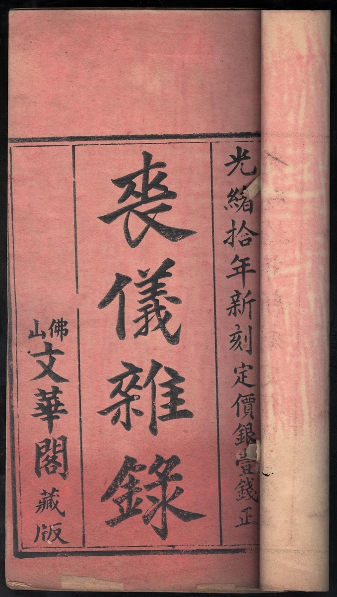 1884年 (光緒十年) 佛山文華閣刊印 "喪儀雜錄" 綫裝本一册, 木版印刷. 品相中上.