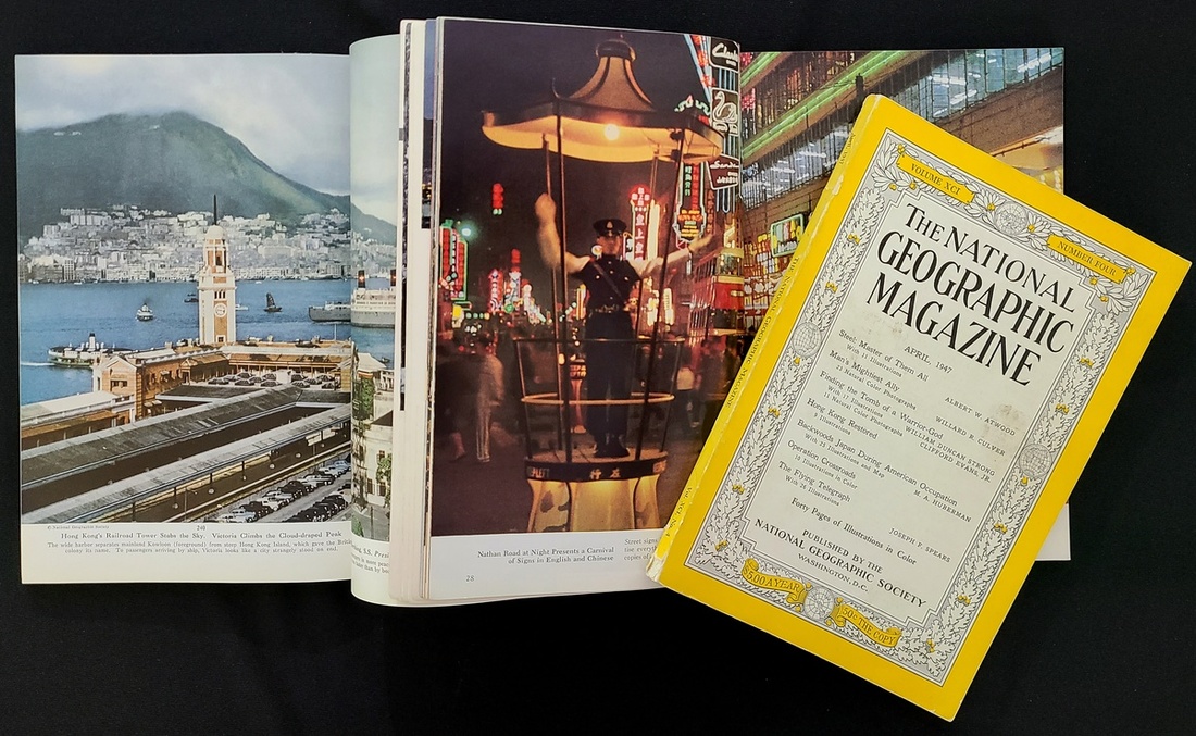1947年4月号, 1954年2月号及1962年1月号, 共三本"The National Geographic Magazine" 國家地理雜誌, 每期都有介紹香港, 其中1962年1月号香港內容有两處圖片被剪掉. 此外均保存良好.