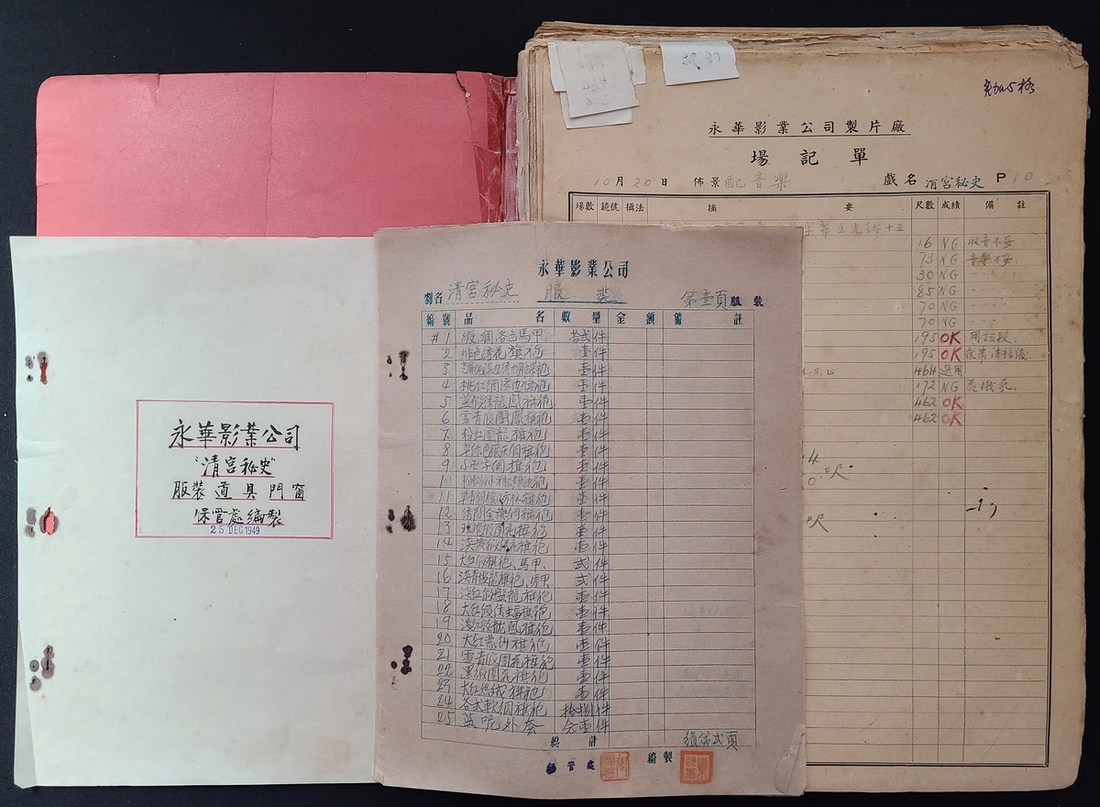 1949年香港永華影業公司電影"清宮秘史" 的原始拍攝記錄文獻一批, 包括由1949年5月20日至10月20日的演員化裝服裝記錄及場記單一大批; 服裝, 道具及門窗保處編製的登記册一本; "清宮秘史" 監製李祖永與日本代理的來往書信一組, 並提及日皇觀看過後給于好評; "清宮秘史" 電影插曲歌詞一枚及"清宮秘史" 特刊一册. 此為研究早年香港電影史最難得的原始材料, 可遇不可求. 敬希預覧.