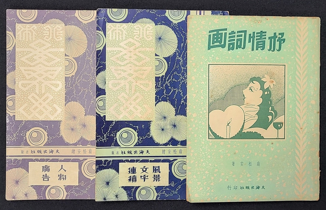 1950年代香港美術圖案書 "人物廣告" 编, "風景文字連續" 編, 及"抒情詞畫" 各一册, 繪畫者及著者皆為翁松安. 香港海天出版社出版.