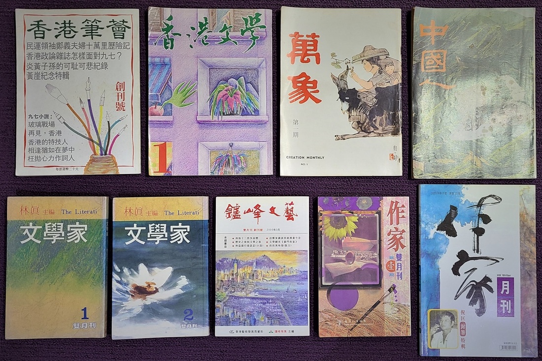 1970-2000年香港文藝雜誌創刊號七種; 包括: 1975年"萬象", 1979年"中國人"月刋, 1985年"香港文學" 月刋, 1987年 "文學家" 雙月刋(加第二期一本), 1993年 "香港筆薈" 季刋, 1998年 "作家" 雙月刋, 及2000年 "鑪峰文藝" 雙月刋等. 另有2005年3月號作家月刋 "倪匡封筆特輯" 號一本. 共九册.