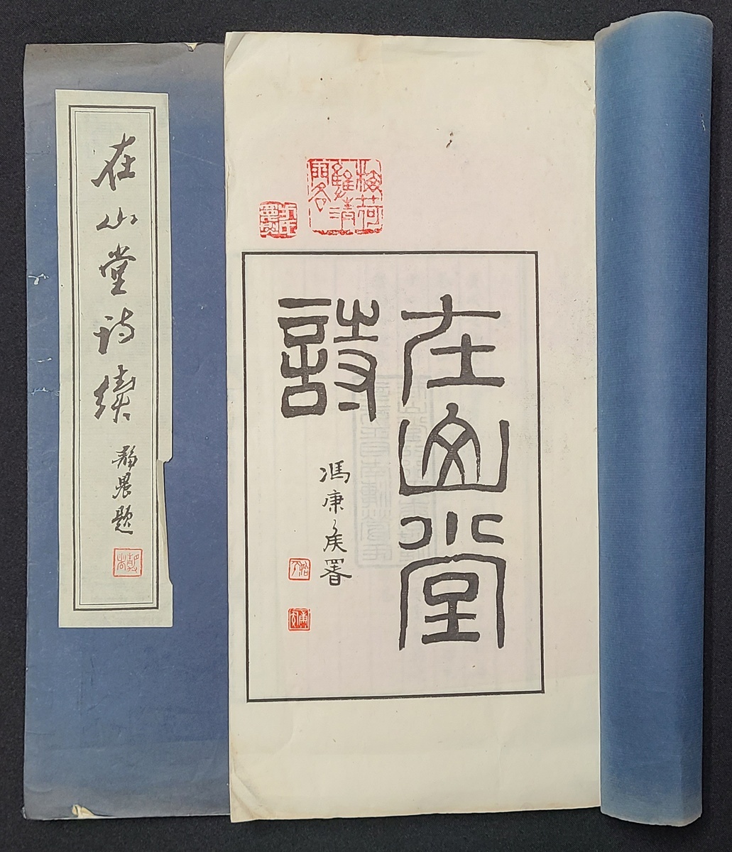 1971年 (辛亥年) 勞天庇著"在山堂詩" (題簽已失) 及1981年(辛酉年) "在山堂詩續" 線裝本各一册. 後者為作者簽贈本. 两書皆為方寬烈先生舊藏, 鈐"梅荷雙清閣" 朱文印及 "方氏寬烈" 白文印各一枚.