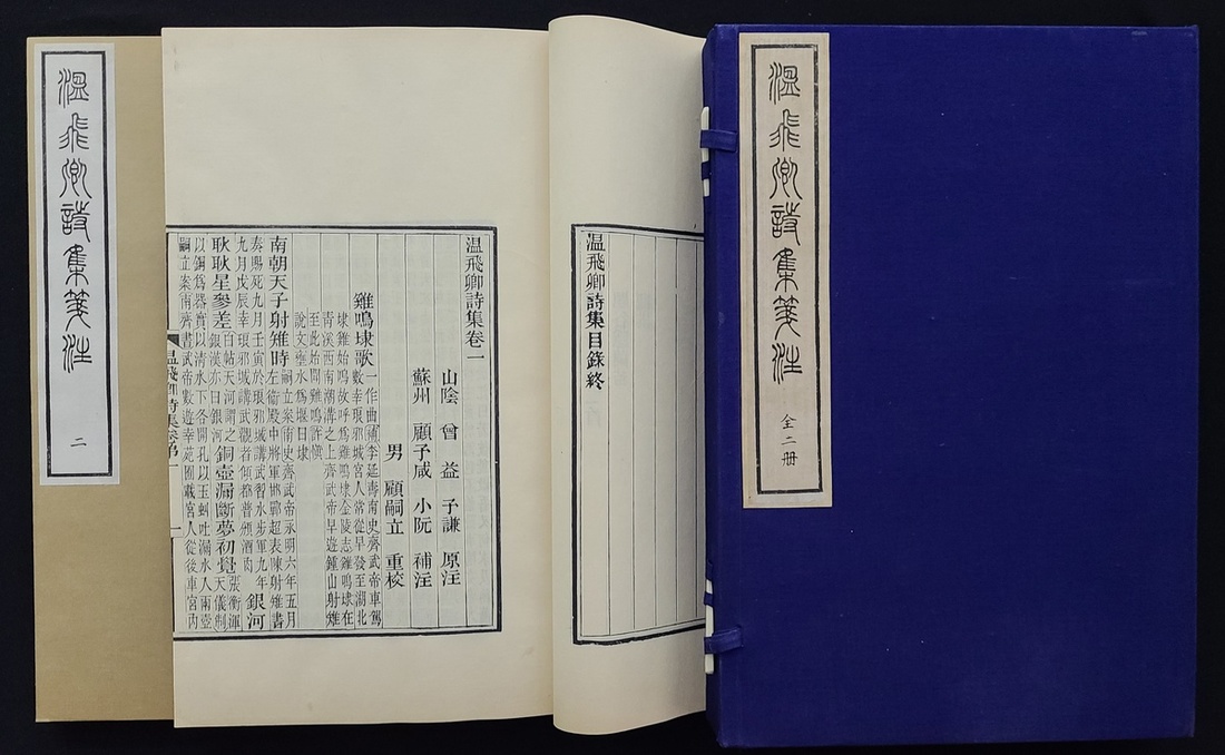1980s "Annotation to Wen Feiqing's Collection of Poems", printing by Beijing China Book Shop. Two volumes with cover, bamboo paper, woodcut thread-bound. This book is re-engraved and printed according to the Qing Dynasty edition. The entire book is well preserved. (29 x 19.8 cm)