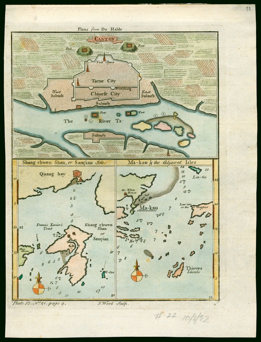 1735 Plans:"Canton", Shang chwen Shan or Sancian Isle" and "Ma-kao & the Adjacent Isles" Unmounted. Cartographer: du HALDE, Jean Baptiste. Coloured, copper engraving. Image size: 6" x 8.5'. Clean.