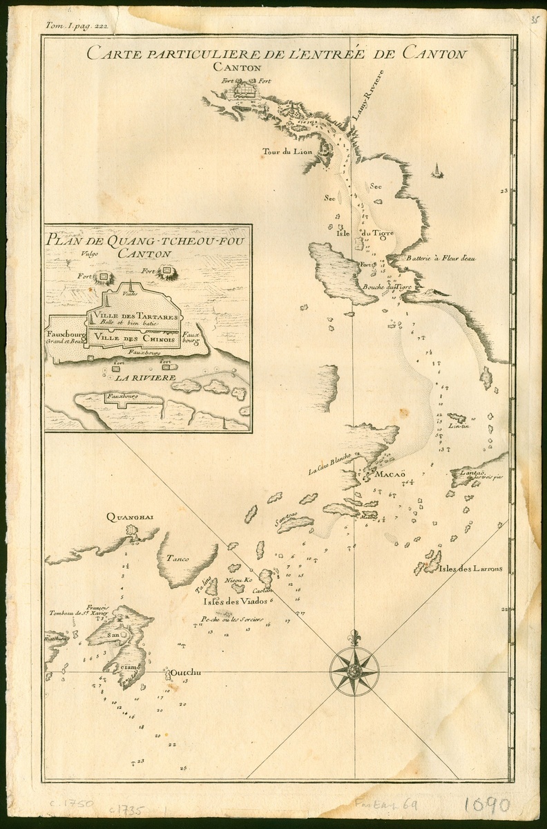 1764 "Carte Particuliere de I'entree de Canton" (Tome. I, pag. 222). Cartographer: Unknown. Unmounted. Image size: 10" x 15.5". Not coloured, copper engraving. Creased, water stain at right.