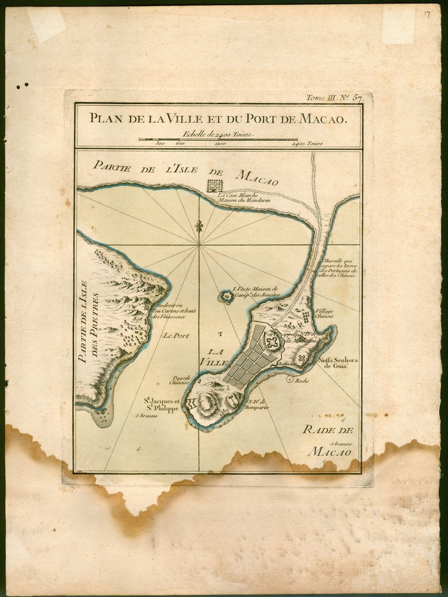 1764 "Plan de la Ville et du Port de Macao" (Tom. III. No. 57). Cartographer: BELLIN, Jacques-Nicolas. Coloured, copper engraving. Image size: 7" x 9". Water stains at bottom.