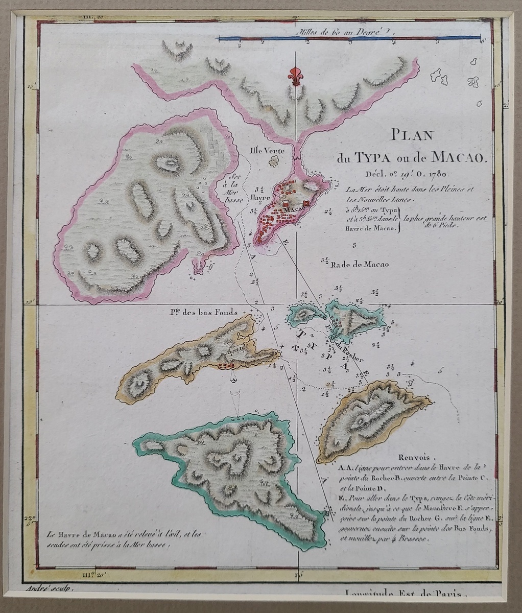1770 "Plan du Typa ou de Macao" printed in Paris. Cartographer: BONNE, Rigobert. Mounted, coloured, copper engraving. Image size: 6" x 7". Clean and fresh.