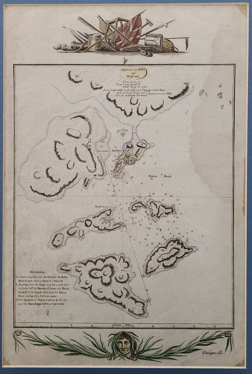 Detailed chart of Macao and nighbouring islands from Cook's voyages. Outside the top border there lies fallen armour and a London "sic" flag. Bottom outside is a man's head adorned with a leaf garland. Includes town plan, soundings, some topography with notes and observations.