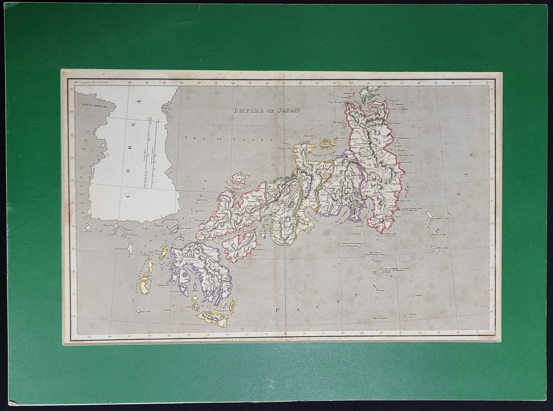 1807 "Map of Japan" British engraving and printing, hand-coloured, with little stains, mounted. (27 x 42 cm)
