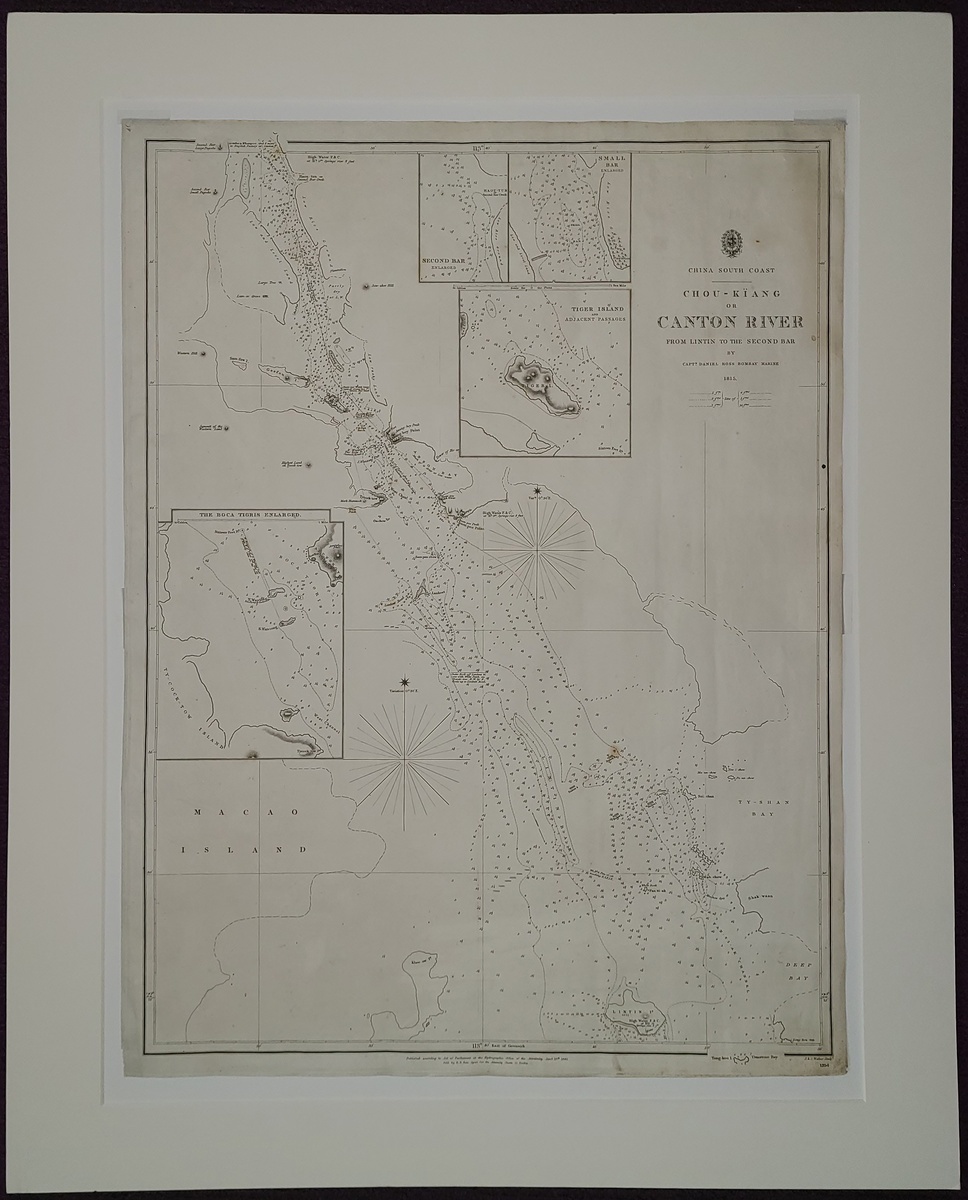 1840 "China South Coast, Chou Kiang or Canton River from Lintin to Second Bar" Published according to Act of Parliament at the Hydrographic Office of the Admiralty, 1840. Cartographer: ROSS, Captain Daniel. Mounted, not coloured and fairly clean. Image size: 19" x 25".
