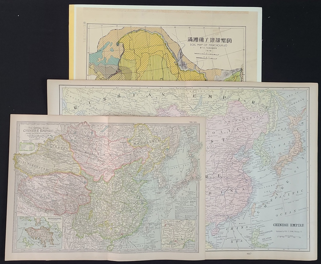 1897-1900s Two maps of China in color printing; the first is printed in the United States in 1897 (40.5 x 29.5 cm), including the map of Hong Kong in the lower left corner; the second is also printed in the United States in the 1900s (37 x 56 cm); and the other 1938 colour printed " Soil Map of Manchoukuo (38 x 50.5 cm). All three maps have creases and no mounting.