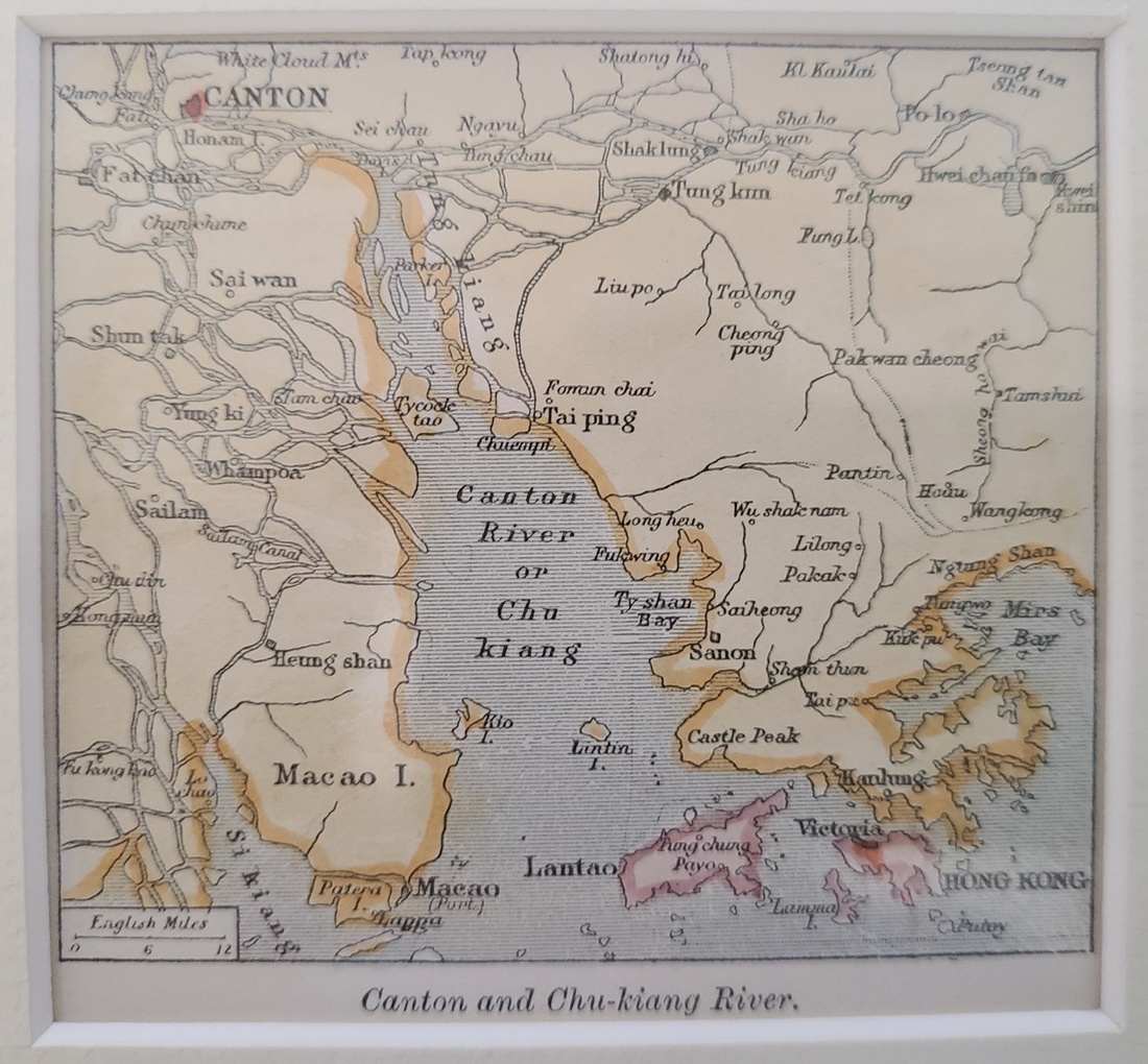 1905 "Canton and Chu-kiang River". Cartographer: Harmsworth Encyclopedia. Mounted, coloured, clean and fresh. Image size: 3" x 3".