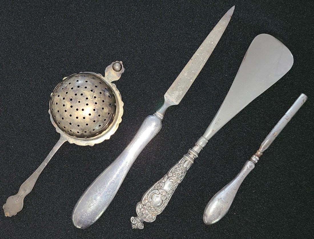 1910-1920年代歐洲銀製器具四件. 每件銀器上均有hallmark.