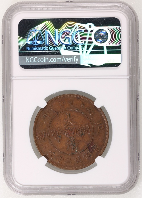 光緒三十二年戶部丙午大清銅幣當制錢二十文,中心滇川,罕版,NGC AU Details,有環境損害,# 2137502-006