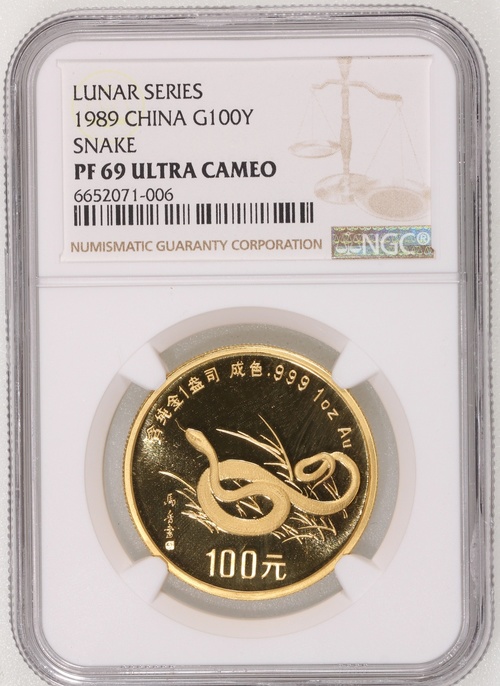 1989年中國十二生肖蛇年精鑄金幣100元,重1盎士,NGC PF69 Ultra Cameo,發行量3000枚,#6652071-006