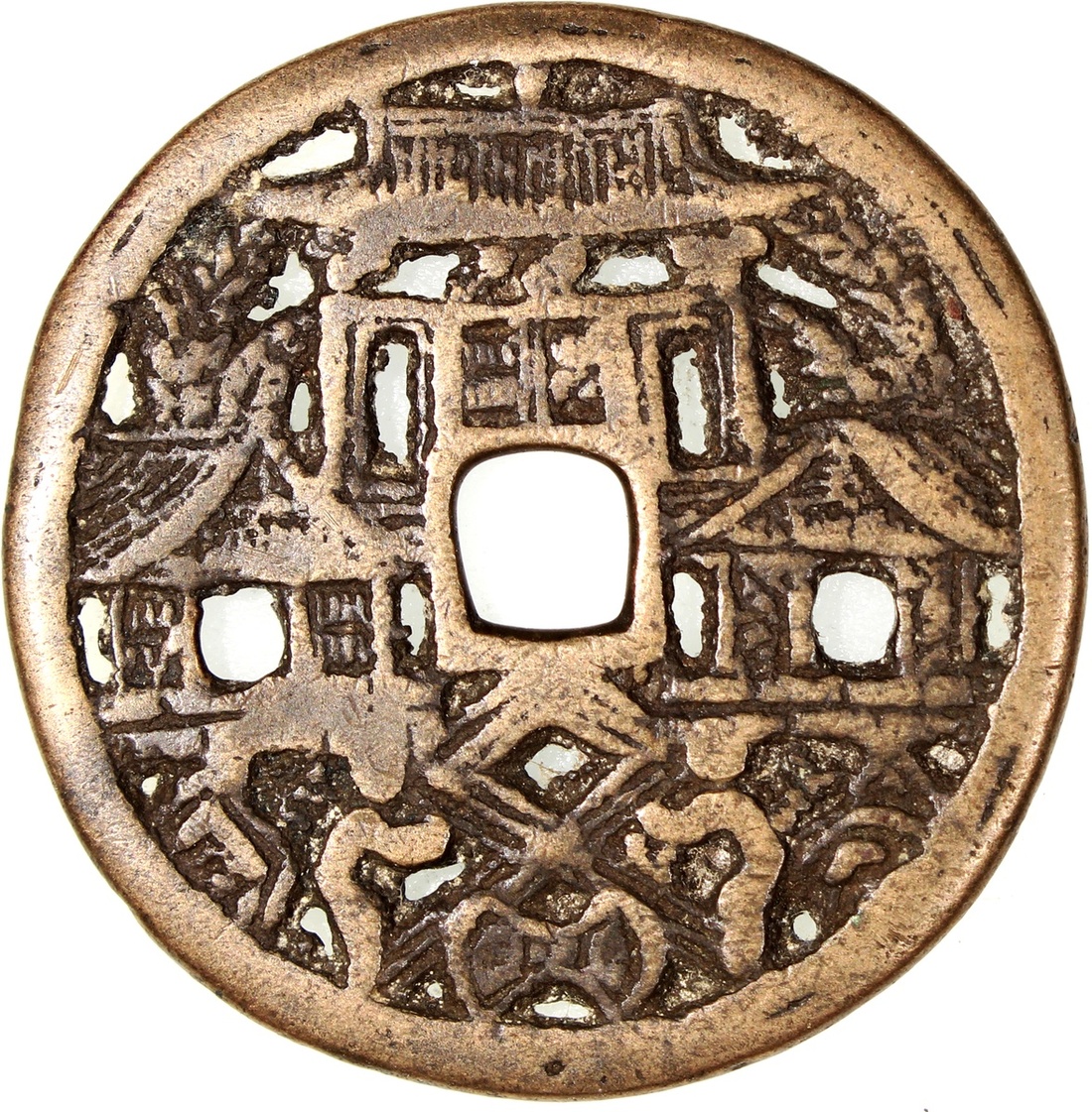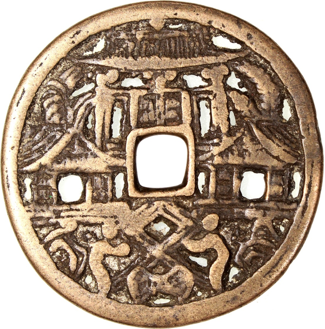 China: Liao-Jin Dynasty (916-1234 CE), openwork charm, pavilion and human figures, 48.2*2.0mm, 24.0g. Edition of smaller size, rare. This is the same example that is used in Dr Burger's article on Chinese charms entitled Coins Which are Not Money: Cultural Functions and Symbolism collected in the book Money in Asia (1200-1900): Small Currencies in Social and Political Contexts edited by Jane Kate Leonard and Ulrich Theobald, Brill 2022.