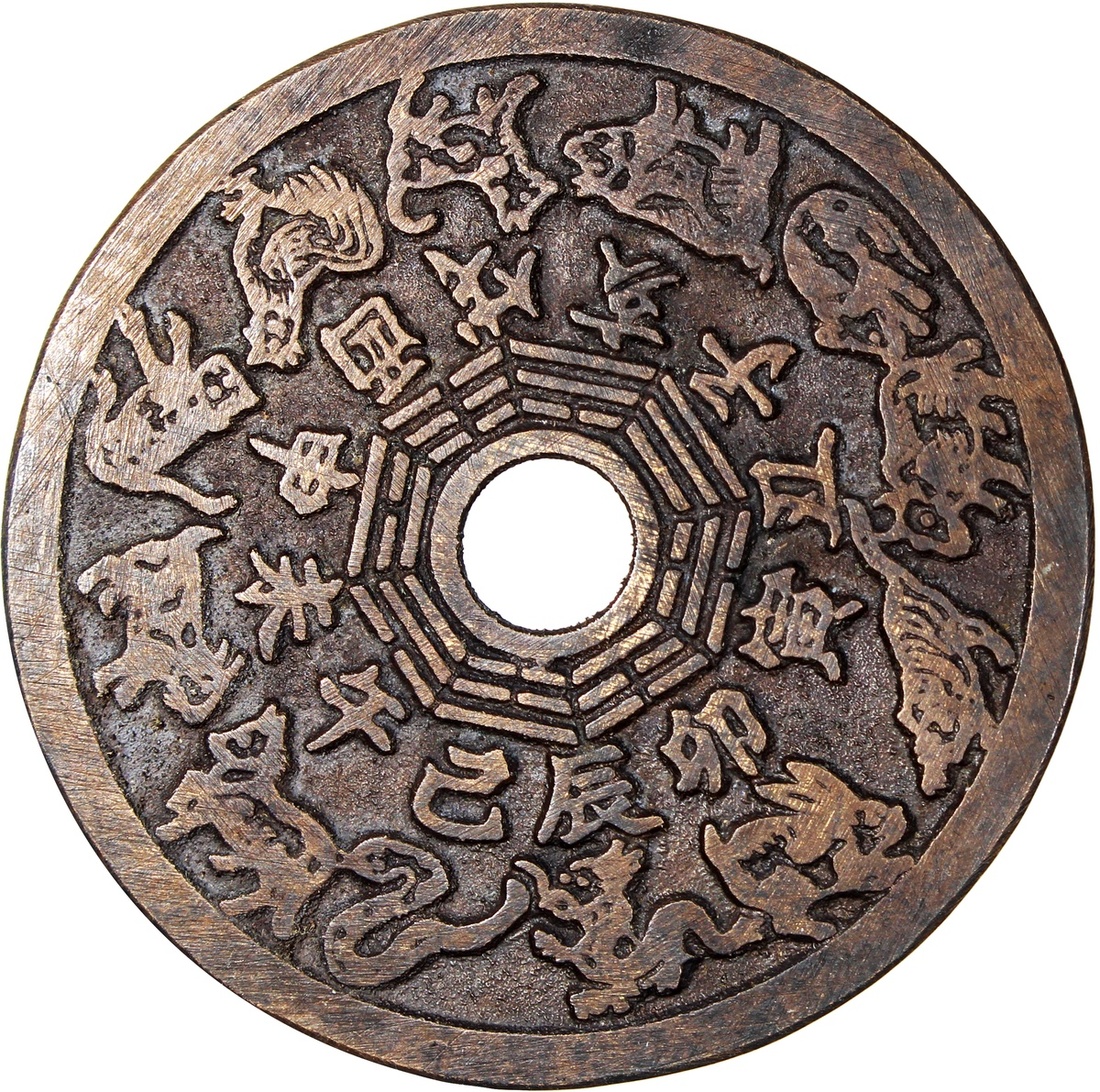 China: Qing Dynasty (1644-1911 CE), coin-like charm with round hole, obverse inscribed Taoist incantation, reverse inscribed Bagua signs and their corresponding characters, 58.1*2.2mm, 36.9g.
