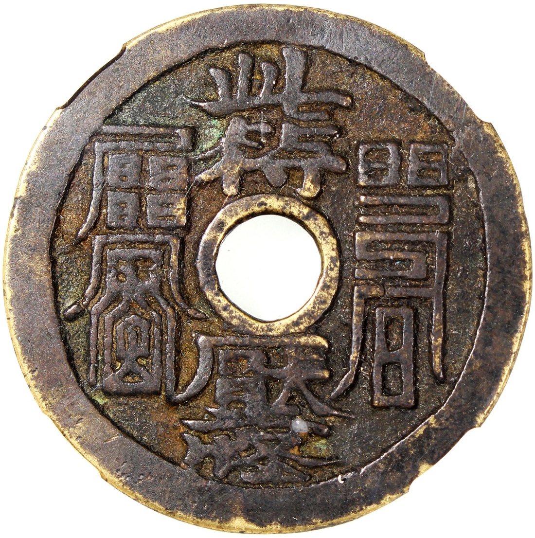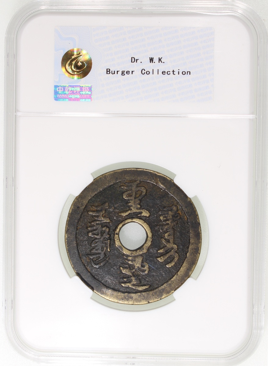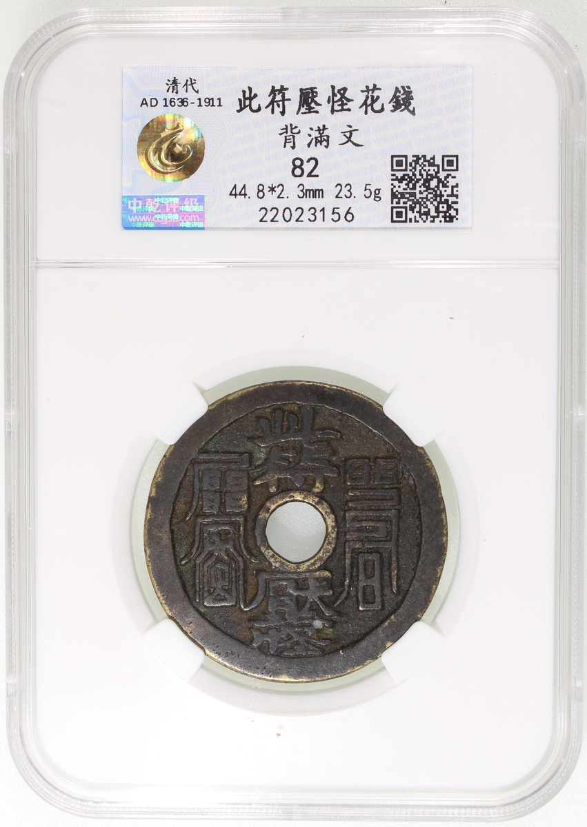 China: Qing Dynasty (1644-1911 CE), coin-shaped charm with round central hole, obverse inscribed 'Ci fu ya guai', reverse inscribed Manchu characters, 44.8*2.3mm, 23.5g, Zhong Qian 82. Extremely fine, very rare. Note: This is the same example that is used in Dr Burger's article on Chinese charms entitled Coins Which are Not Money: Cultural Functions and Symbolism collected in the book Money in Asia (1200-1900): Small Currencies in Social and Political Contexts edited by Jane Kate Leonard and Ulrich Theobald, Brill 2022. According to Burger, the left Taoist spell character on the obverse means "to ward off evil spirits from boats and carts" while the right one from chicken, geese and other birds. Burger also writes that the Manchu scripts on the reverse read "The heavenly official [may] grant luck" (Abka-i hafan hu?turi isibumbi ). This charm is also included as No 256 in the Volume of Charms of A Pictorial Catalogue of Rare Chinese Coinage by Yu Liuliang and Zhu Yongkun (Shanghai Science and Technology Press 2014). It is graded as Degree 8 out of 12 rarity degrees.