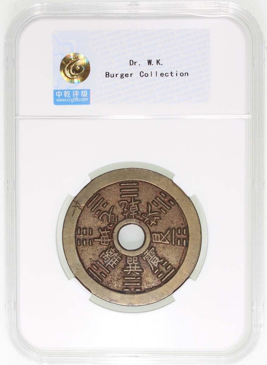 China: Qing Dynasty (1644-1911 CE), coin-like charm with round hole, Jiangsu mint production, obverse inscribed Taoist incantation, reverse inscribed Bagua signs and their corresponding characters, 46*2.4mm, 24.0g, Zhong Qian 82. Extremely fine, a beautiful example.