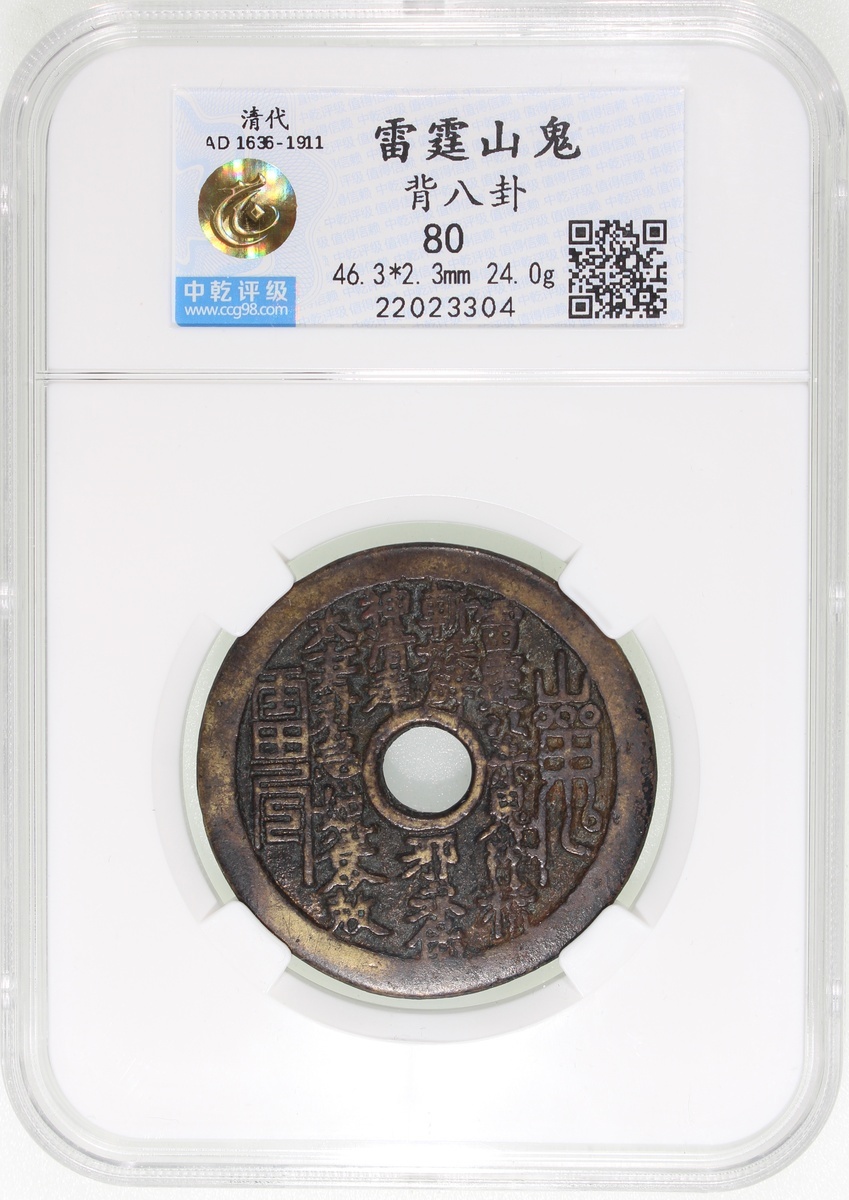 蘇爐山鬼雷霆咒花錢,背八卦,清朝(公元1644–1911),46.3*2.3mm,重24.0g,中乾80。品相極美,好品。