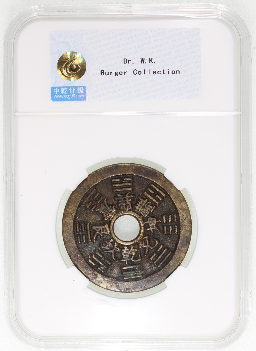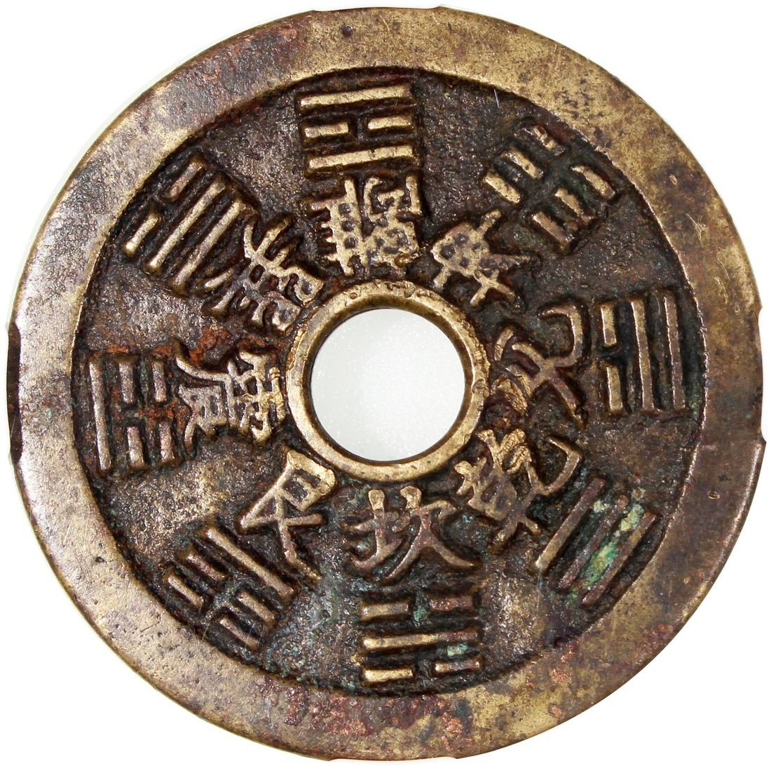 China: Qing Dynasty (1644-1911 CE), coin-like charm with round hole, Jiangsu mint production, obverse inscribed Taoist incantation, reverse inscribed Bagua signs and their corresponding characters, 44.8*2.0mm, 20.0g, Zhong Qian Genuine. Extremely fine, a beautiful example.